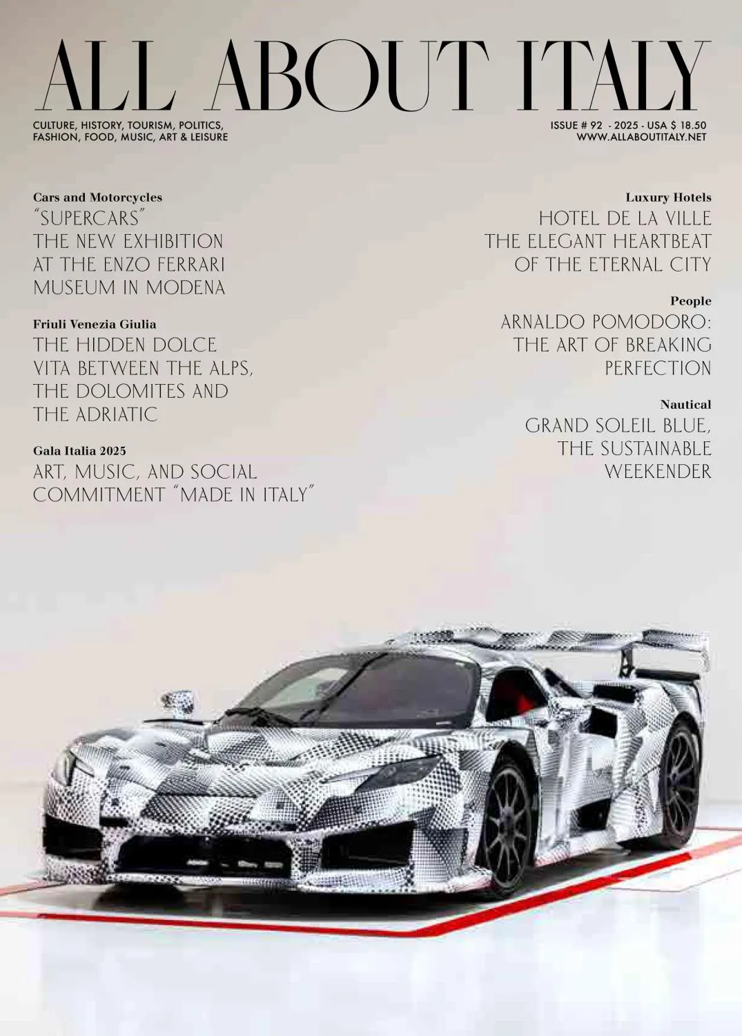 Seit 1997 ist All about Italy das führende italienische Magazin, das die Kultur und Produkte Italiens in die Vereinigten Staaten und Kanada bringt. Es handelt sich um eine einzigartige Publikation, die sich auf die besten Traditionen der italienischen Kultur konzentriert und dabei besonderes Augenmerk auf Kunst, Geschichte, Musik, Design, Folklore, Tourismus und Mode legt.