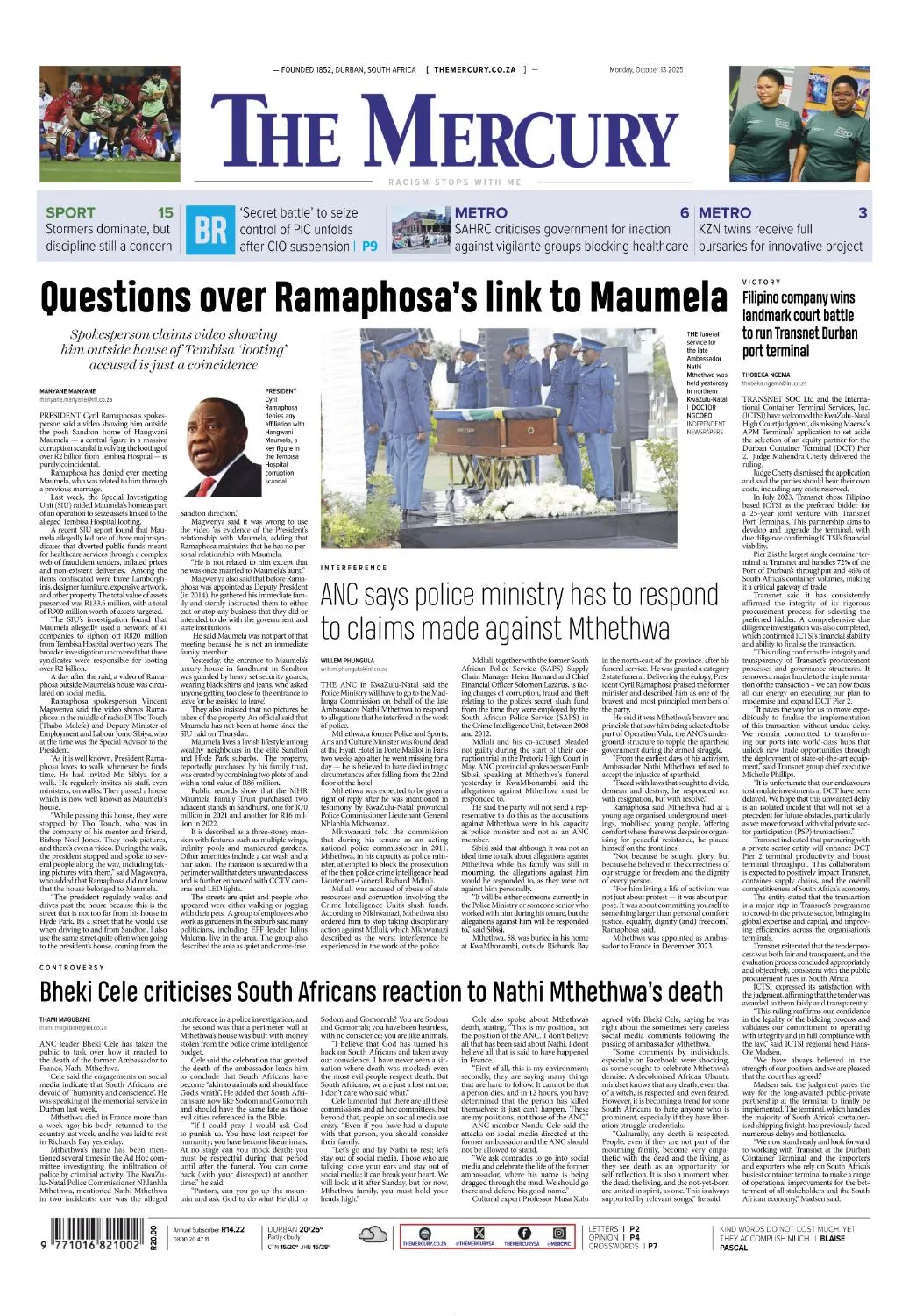 Morning daily covering KwaZulu-Natal with national and local reporting, in-depth business coverage and analysis through dedicated opinion and enterprise pages.