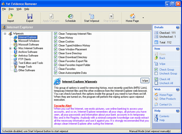 1st Evidence Remover is a complex security system that ensures your security and privacy by destroying all hidden activity information on demand, according to a user-defined schedule or on each boot/shutdown. The program does not damage your Windows and does not delete your documents, it only removes needless registry entries and files that may potentially contain evidence and endanger you needlessly. 1st Evidence Remover also removes temporary files left by your system making it cleaner and running faster. Install 1st Evidence Remover on your PC before it is too late! Try our password and security tools. Free downloads.
