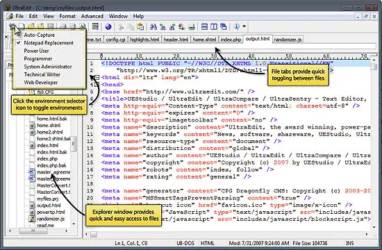 * Environment Selector - Provides predefined or user-created editing "environments" that remember the state of all of UltraEdit's dockable windows, toolbars and more for user convenience.