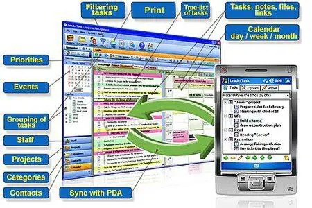 LeaderTask PDA Organizer is a mobile version of LeaderTask for Windows Mobile. With LeaderTask PDA Organizer you will not any longer need your paper notes: "To Buy" or "To Do at Work/ the Bank/Tax Inspectorate/ on My Way Home." You will always have the needed information at hand wherever you need it, because LeaderTask PDA Organizer will always be with you on your pocket computer.