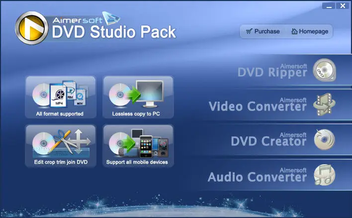 Aimersoft DVD Studio Pack is one of the best multimedia conversion tool that includes FOUR outstanding multimedia applications: Aimersoft DVD Ripper, Aimersoft Video Converter, Aimersoft DVD Creator and Aimersoft Audio Converter. It can perfectly help you rip DVD, convert all video and audio files and burn these files to DVD discs.