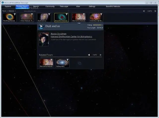 WorldWide Telescope 2.1.8.1 | 18.4 MB A Web 2.0 visualization software environment that enables your computer to function as a virtual telescope. Want to see the same images that scientists at NASA use for their research or perform your own research with those images? Or do you want to see the Earth from the same perspective that astronauts see as they descend to Earth? How about taking a 5 minute break and viewing a panorama of a different city?