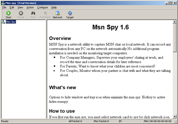 MSN Spy ver.1.6 | 1,91 MB MSN Spy is a network utility to capture MSN chat on local network and save to file. It can record any conversation from any PC on the network automatically. No additional program installation is needed on the monitoring target computers.