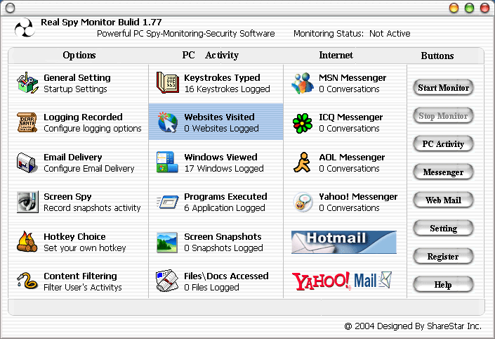 Real Spy Monitor can monitor all PC activity including keystrokes typed, web sites visited, windows opened, program executed, screen snapshots, files/docs accessed and more. It can also record instant messenger conversations including AOL, ICQ, MSN, AIM, Yahoo Messenger, and capture web mail content from MSN, Hotmail, and Yahoo. The program can run in semi-stealth mode (visible in Task Manager) and automatically send logs to a specified email address. Additional features include screenshot capture and content filtering. The program does not include any documentation. Because it is sold commercially, most anti-virus vendors do not detect them. The most common form of a commercial monitoring tool comes in the form of a keystroke logger, which intercepts keystrokes from the keyboard and records them in some form of a log. This can then be sent to whoever installed the keystroke logger, or keylogger, onto the machine.