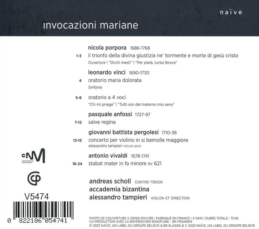 For the first time with naïve, the counter-tenor Andreas Scholl joins the Accademia Bizantina and Alessandro Tampieri to present a Neapolitan programme, centred on the Virgin Mary. Andreas Scholl and the Accademia Bizantina have for several decades enjoyed a successful musical partnership, encompassing the whole Baroque repertoire. As usual, this new album together includes both renowned and less well-known vocal and instrumental pieces. The figure of Mary, which has inspired a huge repertoire, both sacred and profane, runs through this Easter programme of exquisite affliction, virtuosic for both voice and orchestra. Vivaldi's iconic Stabat Mater, which the German counter-tenor has enjoyed singing for many years, is placed alongside lesser-known airs from oratorios by Nicola Porpora and Leonardo Vinci, which had the character of the Virgin sung by a castrato. We also find a Salve Regina by Pasquale Anfossi, requiring a particularly participative orchestra, a sonata by Angelo Ragazzi and a violin concerto by Pergolesi, both strongly echoing Pergolesi's famous Stabat Mater. The solo violin parts are played by Alessandro Tampieri, first violin of the Italian ensemble, who conducts here from his instrument in the purest tradition of the Baroque orchestra.