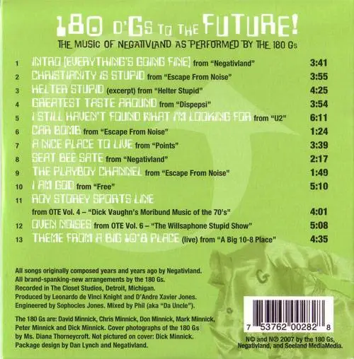 180 D'Gs To The Future! is the 2007 CD by The 180 Gs. The entire presentation consists of Negativland cover versions performed in a vocal/doo-wop fashion.